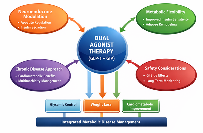 Figure 1 presents a conceptual framework illustrating how dual agonist therapy (GLP-1 + GIP) influences multiple physiological systems to achieve integrated metabolic disease management. The framework is structured around a central therapeutic mechanism-dual incretin receptor activation-which interacts with four interrelated domains: neuroendocrine modulation, metabolic flexibility, chronic disease management, and safety considerations. These domains collectively drive key clinical outcomes, including glycemic control, weight loss, and cardiometabolic improvement.
