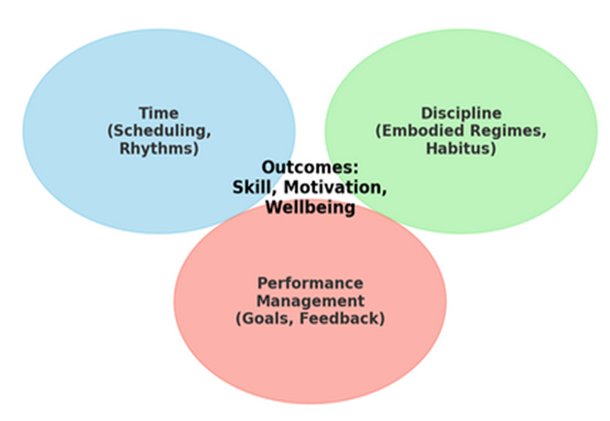 The time domain emphasises scheduling, structured practice, and embodied rhythms necessary for skill acquisition, echoing Ericsson et al.’s (1993) theory of deliberate practice, which stresses the critical role of structured hours. Discipline reflects both external regulation (rules, attendance, technique enforcement) and internalised bodily dispositions or habitus (Bourdieu, 1977). This disciplinary dimension supports consistency but can also impose restrictive norms, aligning with Foucault’s (1977) analysis of how institutions regulate bodies. Performance management represents the goal-setting, feedback, and assessment processes that scaffold self-regulation and sustain motivation (Locke & Latham, 2002; Deci & Ryan, 2000).